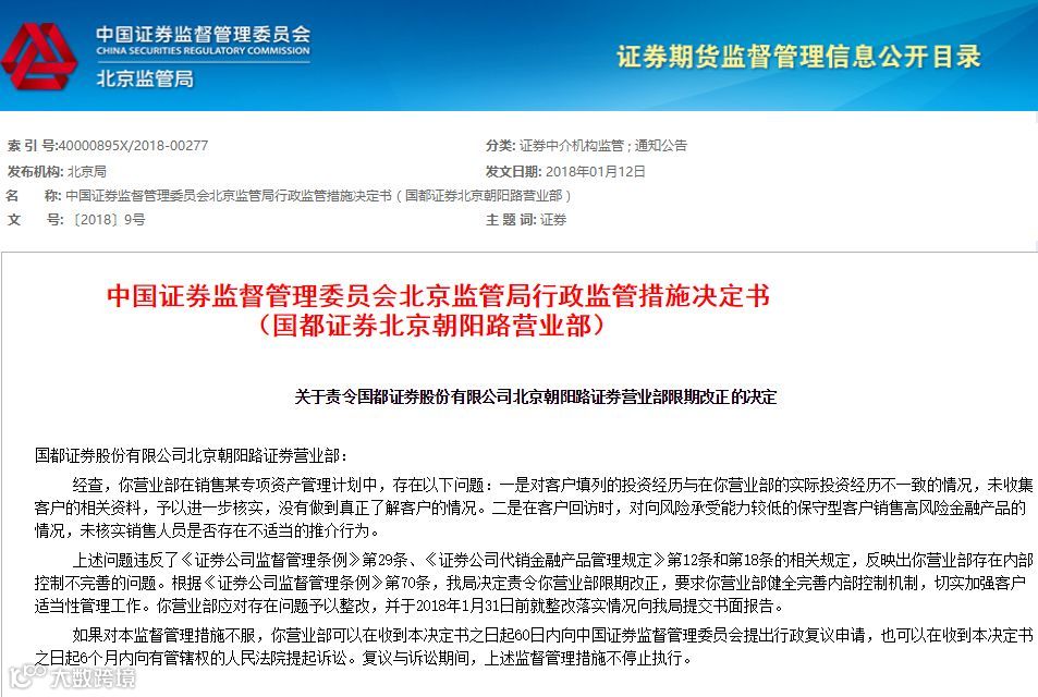 北京证监局要求,国都证券营业部健全完善内部控制机制,切实加强客户适当性管理工作。该营业部应对存在问题予以整改,并于2018年1月31日前就整改落实情况向北京证监局提交书面报告。