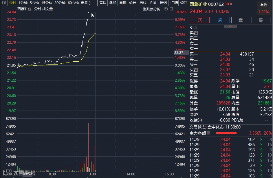 7月24日,临近午盘时分,锂矿股集体拉升,西藏矿业、永杉锂业直线涨停,华友钴业随后也封死涨停板,天齐锂业逼近涨停,盛新锂能、天华新能、赣锋锂业、融捷股份、永兴材料等涨幅均超过7%,亿纬锂能、盐湖股份、中矿资源等纷纷跟涨。
