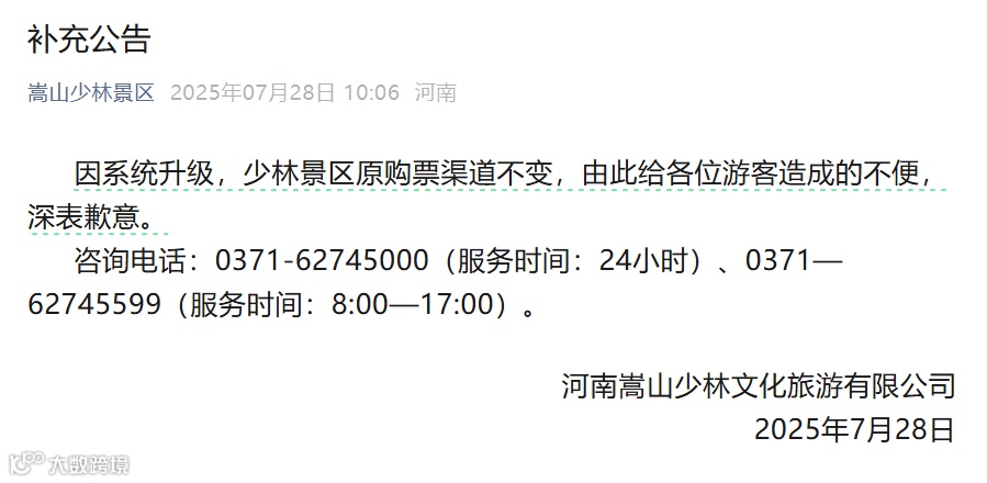 公告称,因系统升级,少林景区原购票渠道不变,由此给各位游客造成的不便,深表歉意。