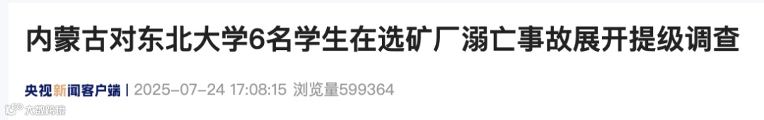 7月23日10时20分许,东北大学6名学生在中国黄金集团内蒙古矿业有限公司乌努格吐山铜钼矿选矿厂参观学习浮选工艺过程中,因格栅板脱落坠入浮选槽。经全力施救,6人被救出后,医护人员确认已溺亡。另有1名老师受伤。