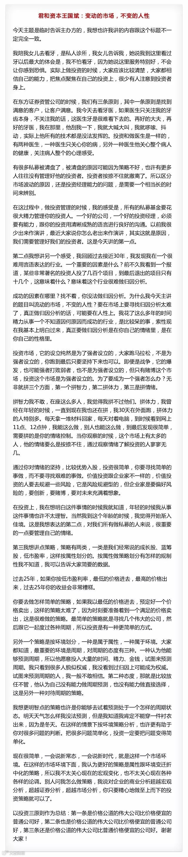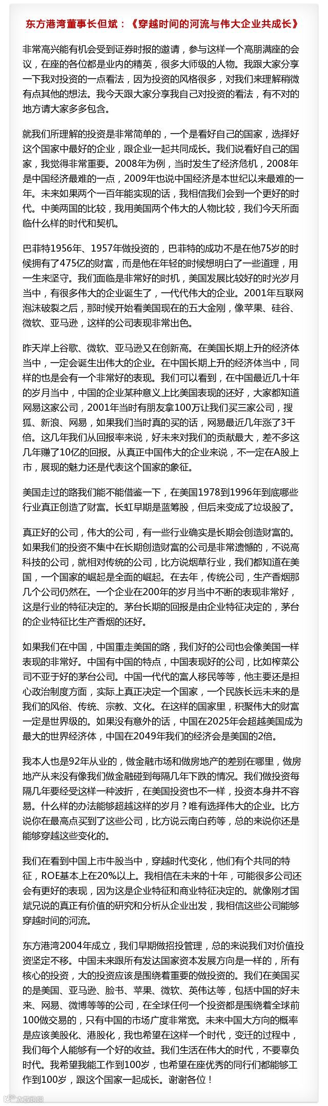 “做金融市场和做房地产的差别在哪里?做房地产的从来没有像我们做金融这样碰到每隔几年就下跌的情况。我们每隔几年就要经受这样一种波折,投资本身并不容易,什么样的办法能够超越这样的岁月?唯有选择伟大的企业。”
