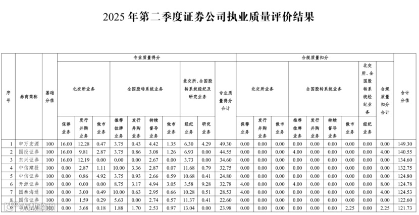 按照惯例,北交所、股转公司都会在每年第一、二、三季度结束后的第15个交易日前发布季度主办券商执业质量评价结果。7月18日,北交所、股转公司发布了2025年第二季度主办券商执业质量评价结果的公告,评价结果显示共有103家券商参评。