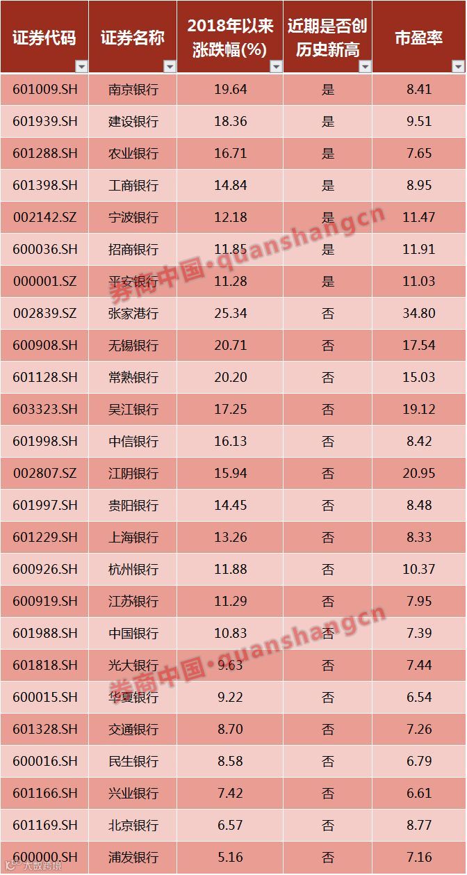 涨幅方面,25只银行股年后涨幅低于10%的仅7只,涨幅超过15%的共有9只,分别是张家港行、无锡银行、常熟银行、南京银行、建设银行、吴江银行、农业银行、中信银行、江阴银行。