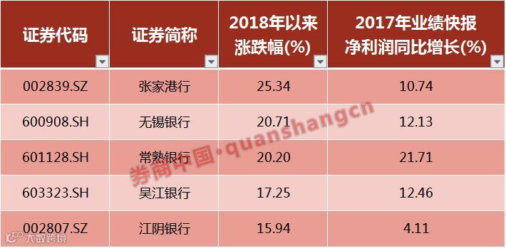 常熟银行、吴江银行、无锡银行、张家港行、江阴银行的2017年业绩快报至今全部出齐,净利润同比增幅分别为21.71%、12.46%、12.13%、10.74%、4.11%,常熟银行遥遥领先,而且整体增幅较大行让存在较大优势。