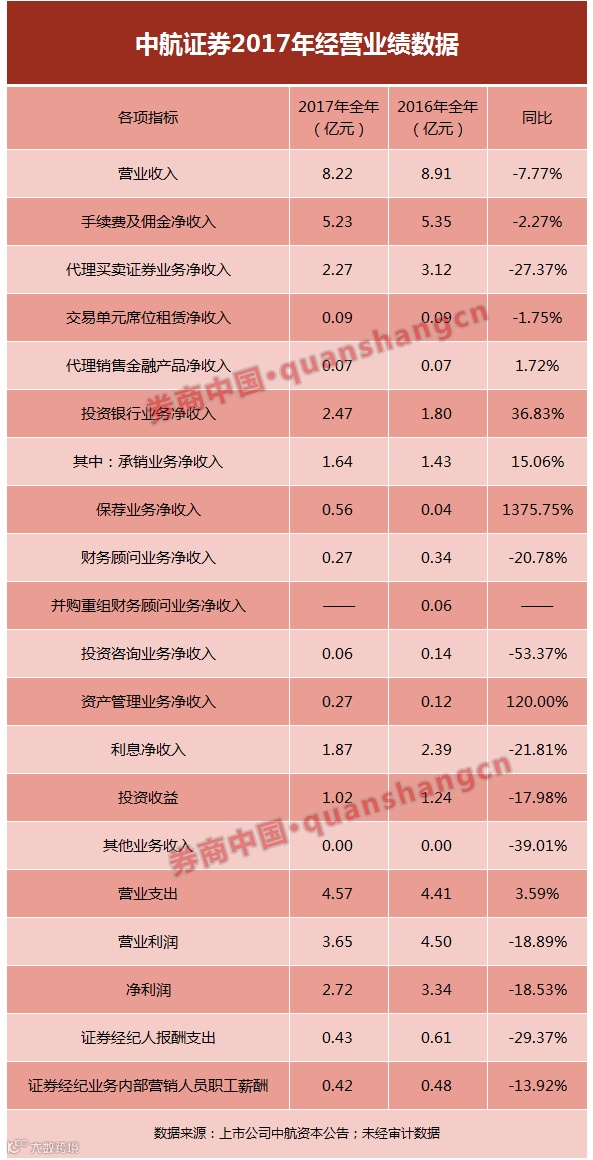 全年来看,2017年中航证券实现净利润2.72亿元,同比下跌近两成。若以2016年97家证券公司的财务数据排名为参照,中航证券这一净利水平位列第69位;中航证券2017年实现营业收入8.22亿元,同比下降8%,以2016年为参照,这一水平位于行业第78位。