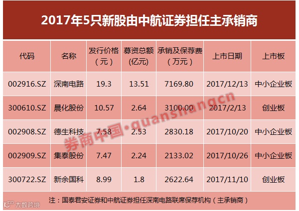 券商中国记者梳理发现,2017年全年,中航证券成功保荐四家企业A股IPO通过审核,分别是广州集泰化工股份有限公司、广东德生科技股份有限公司、江西新余国科科技股份有限公司、深南电路股份有限公司这四家企业。其中,深南电路由中航证券和国泰君安证券担任联席主承销商。