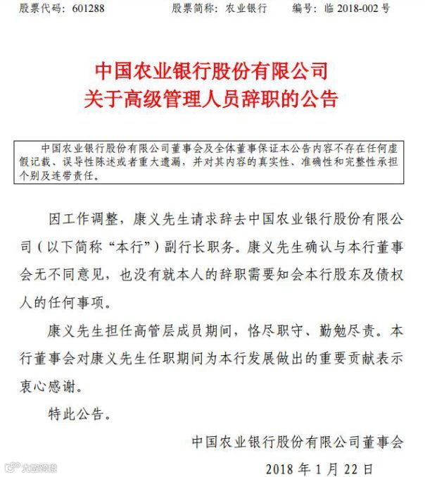 1月22日,农业银行发布公告称,“因工作调整,康义先生请求辞去中国农业银行股份有限公司(以下简称“本行”)副行长职务。康义先生确认与本行董事会无不同意见,也没有就本人的辞职需要知会本行股东及债权人的任何事项。康义先生担任高管层成员期间,恪尽职守、勤勉尽责。本行董事会对康义先生任职期间为本行发展做出的重要贡献表示衷心感谢。”