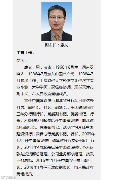 实际上,早在上周召开的天津市十六届人大常委会举行的第四十二次会议上,会议就审议并通过了市政府提请审议的人事任职议案,决定任命康义、金湘军为天津市副市长。而在天津市人民政府官网上,市政府领导一栏中已出现康义的名字和履历介绍。