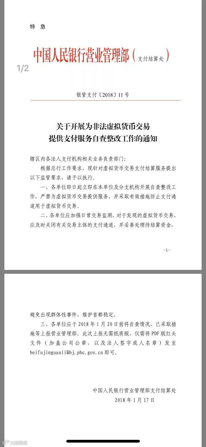 继1月16日券商中国报道互联网金融风险专项整治工作领导小组(下称“互金整治办”)将从“挖矿”、支付等多维度加强对虚拟货币场外交易的清理整顿后(《各大虚拟货币大幅下挫!监管重拳整治消息确凿,一波政策在路上》,点击蓝字阅读原文),记者19日又从知情人士了解到,1月17日,央行营业管理部发布《关于开展为非法虚拟货币交易提供支付服务自查整改工作的通知》(下称“《通知》”)。