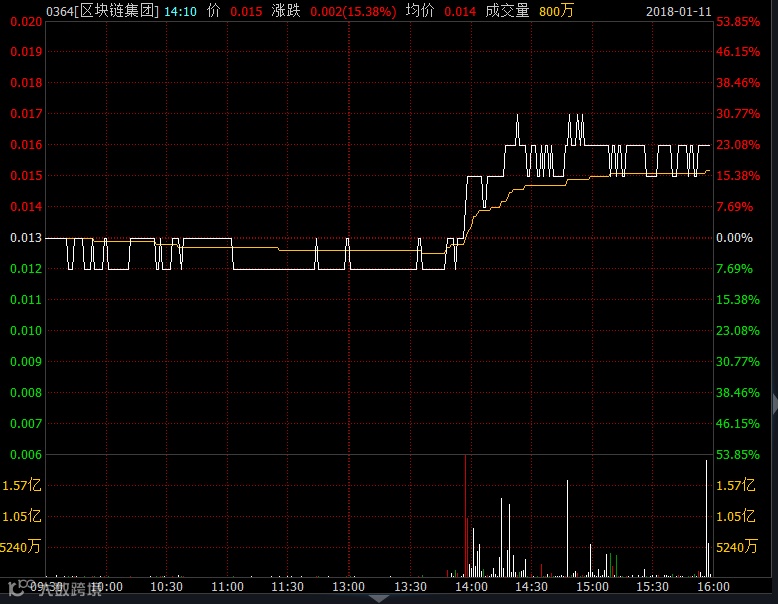 截至今日收盘,区块链集团公司市值达到3.79亿港币,最新收盘价为每股0.016港元(没错,这是一只仙股)。