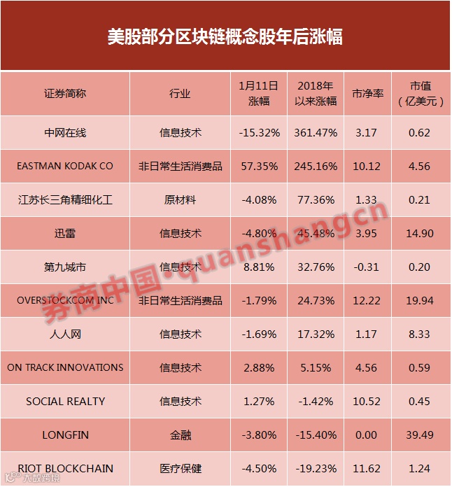 在区块链概念股的发源地,美股市场上的中概股,中网在线、迅雷、第九城市、人人网等中概股也先后因为区块链业务而大涨,今年以来分别上涨了361.47 %、45.48%、32.76%和17.32%,其中迅雷已发行玩客币、人人网传闻筹建区块链平台“人人坊“和发行加密货币RRCoin。