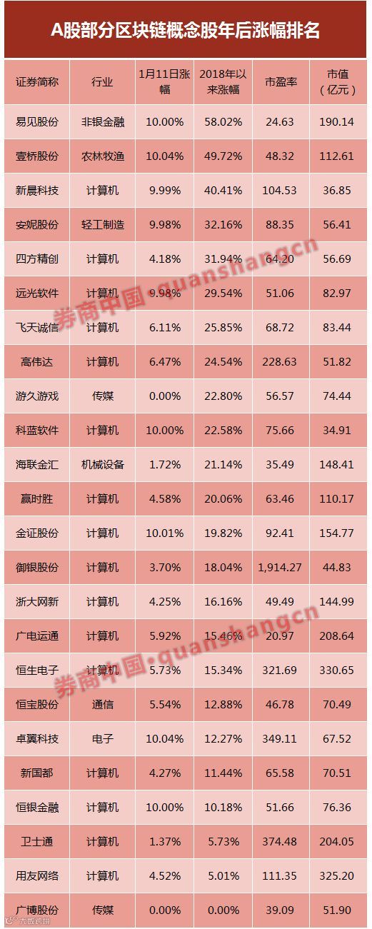 参照WIND统计的区块链概念股,2018年以来,24只区块链概念股中有21只的年后涨幅超10%,13只涨幅超20%,5只涨幅超30%,尽管2018年至今只有8个交易日。