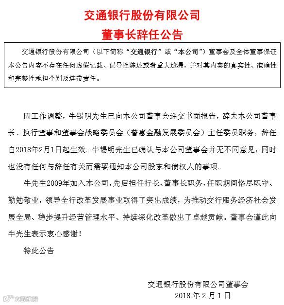 2018年02月--交通银行党委书记、董事长拟任人选。