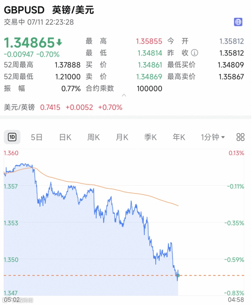 另外,欧洲经济也传来利空信号。据英国国家统计局最新公布的数据,英国经济5月份意外萎缩0.1%,连续第二个月出现下滑。受此影响,英镑兑美元汇率大幅下跌,截至北京时间22:20,报1.3487,跌幅达0.7%。