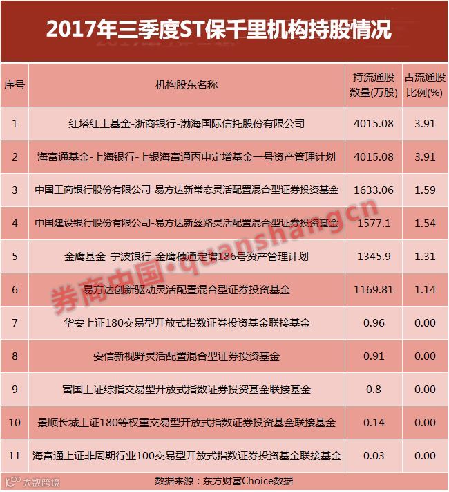ST保千里2017年三季报机构持仓情况显示,除了上述提到的5家定增机构之外,还出现了多只基金产品。