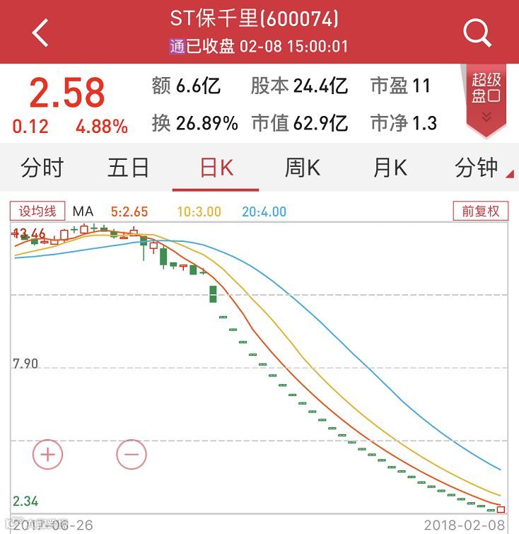 ST保千里自2017年12月29日复牌后股价一路狂跌,从12月29日的9.87元暴跌至2月7日的2.34元,跌幅超过76%。
