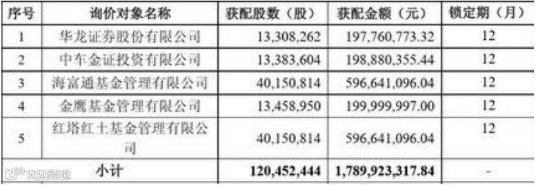 ST保千里这次定增计划参与最终配售的对象除了公司实际控制人庄敏之外,还有5家资产管理机构,分别是红塔红土基金公司的“红塔红土保千里定增特定资产管理计划”、金鹰基金公司的“金鹰穗通定增186号资产管理计划”、海富通基金公司的“上银海富通丙申定增基金一号资产管理计划”、华龙证券公司的“华龙证券金智汇37号集合资产管理计划”以及中车金证投资有限公司自有资金。