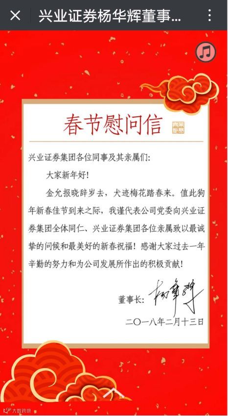 兴业证券董事长杨华辉今天上午携部分高管在上海给每个部门拜年,总裁刘志辉携部分高管在福州给员工们拜年。虽然没有开工利是,但是过年前最后一天给大家发了红包和慰问信。