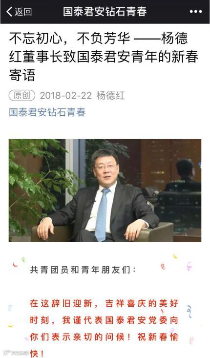 国泰君安董事长杨德红在新年开工的第一天就给国泰君安青年送来了新春寄语。 杨德红在信中说,希望青年朋友们“胸怀大志,志存高远,兢兢业业,脚踏实地,敢于担当,用于拼搏,勤于学习,不断增加知识储备。”