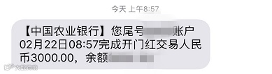 今天一大早,农行广东某支行就将开门红利是发到员工的工资卡里,3000元大利是,虽然少了个红包袋,但红包短信也是满满的仪式感。这位员工向券商中国记者透露,他所在支行发开门红包是很平均的,所有员工都是3000元开门红包,还可以向领导们逗利是。