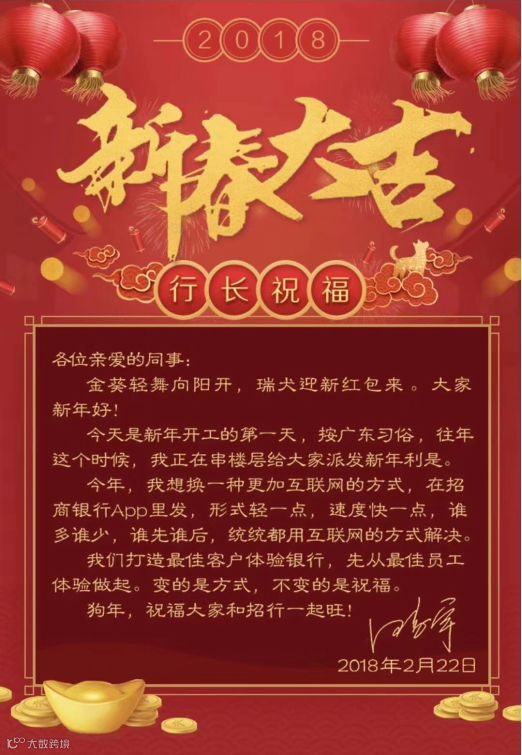 对于招行员工来说,田惠宇发出的新年祝福,也许比红包更鼓劲!