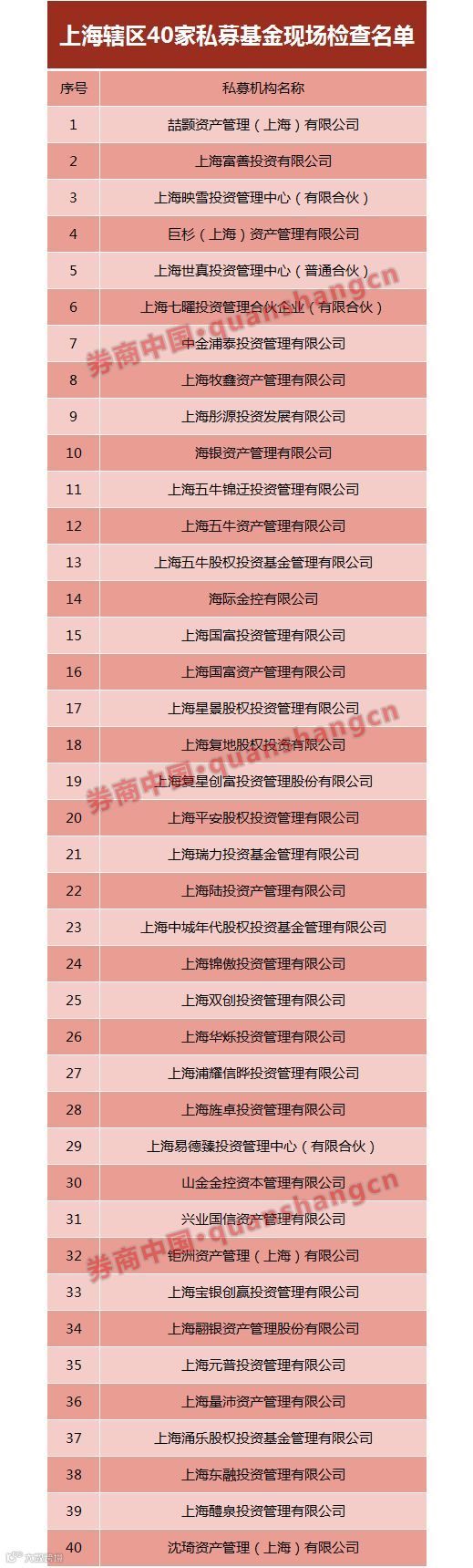 截至2月12日,上海证监局和山西证监局已公布辖区私募基金现场检查名单,共有42家私募基金监管部门的现场抽查对象,今年3月1日起接受证监局的现场检查。上海证监局按照证监会关于2018年私募基金专项检查的工作部署,近日正式启动实施2018年上海辖区私募基金现场检查随机抽查工作,40家私募基金“中彩”,较2017年增加了14家。