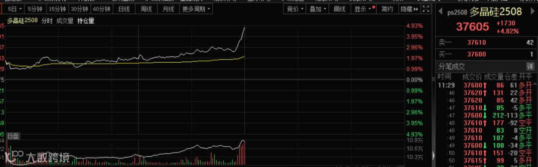 多晶硅期货主力合约周二延续涨势,临近上午收盘前价格大幅拉升,最终主力2508合约上午收盘涨4.82%,触及两个半月高位。