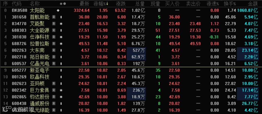 一个板块的爆发,往往跟这个板块的筹码沉淀有关。筹码沉淀得越久,涨起来爆发力越强。之前的创新药是这样,今天的太阳能也是如此。A股太阳能板块今天迎来集体爆发,涨停及涨幅超10%的个股一度接近20只。