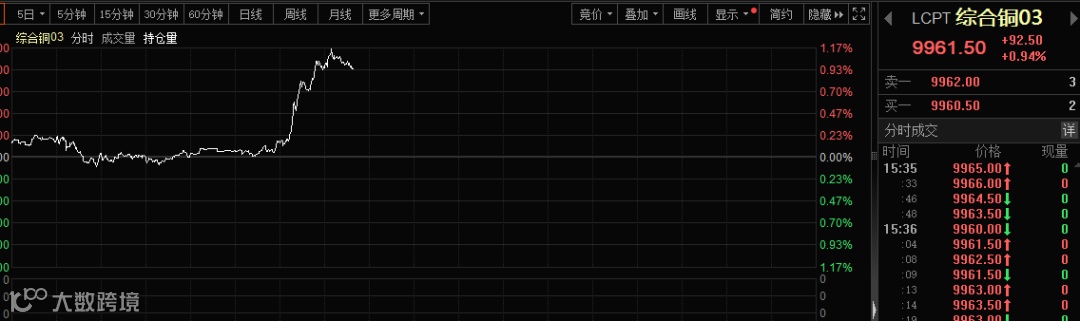 国际铜价午后直线飙升,综合铜一度达到了9984美元的高位。国内沪铜也以上涨1.09%收盘。