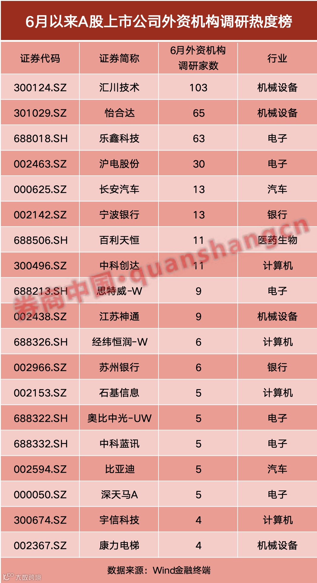 具体来看,外资机构关注度最高的是汇川技术(300124.SZ),该公司是国内工业自动化龙头企业。汇川技术近日公告的投资者关系活动记录表中,6月以来该公司举办了十余场各类调研活动,合计接待了超100家外资机构的调研,包括摩根士丹利、瑞银、莱扎德资产管理公司(Lazard Asset Management)等外资纷纷下场调研。