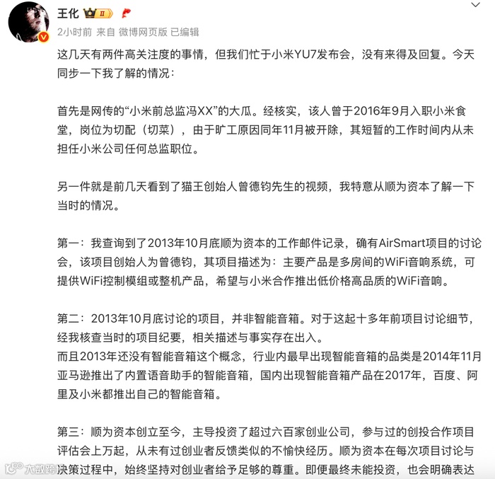 小米回应“前总监”大瓜和猫王音响创始人争议言论