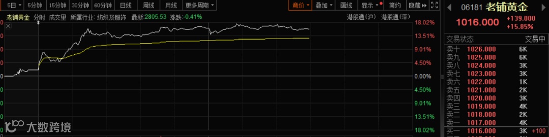 今日,港股老铺黄金一度涨超18%,股价突破1000港元/股,续创历史新高。随后,涨幅有所收窄,但整体涨幅依然非常可观,市值也突破1700亿港元。