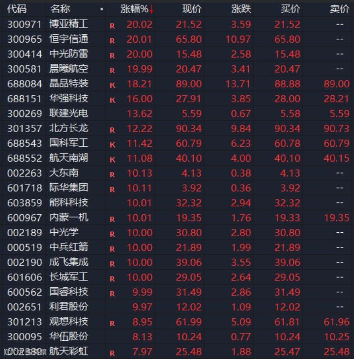 6月30日,军工概念股再度爆发,截至中午收盘,中光防雷、恒宇信通、博亚精工、晨曦航空、成飞集成、际华集团、中兵红箭、长城军工、中光学、国睿科技等近20只相关概念股涨停或涨超10%。