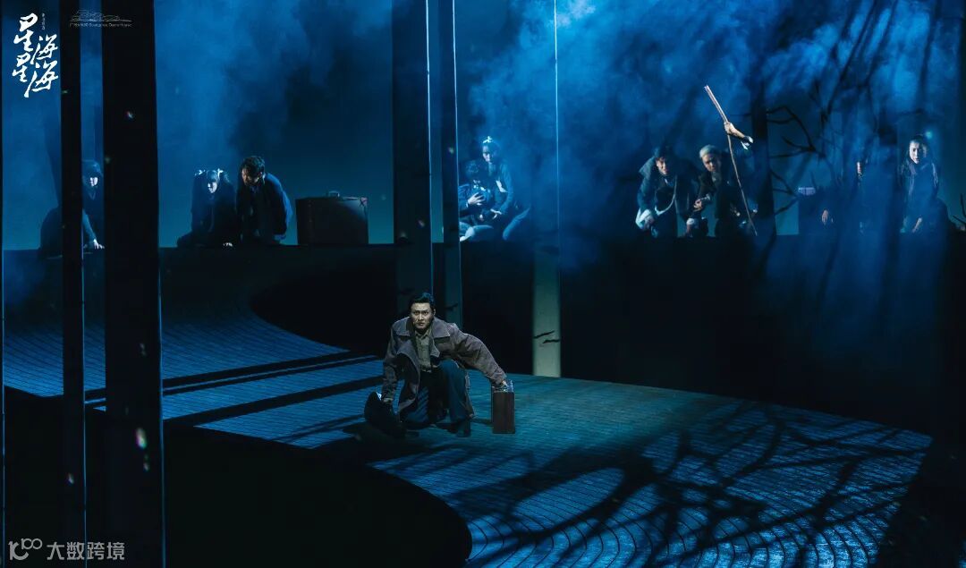 歌剧《星海星海》的视频影像作为舞美设计的一个组成部分,其目的是营造一个是视觉的空间,是戏剧空间的延展。整体的视觉样式是意向化的,以两种形式呈现:一是通过计算机软件把具象的水分解成元素并以粒子运动的动画呈现,二是通过合成、叠加的静态图像来营造一种时空交错感。