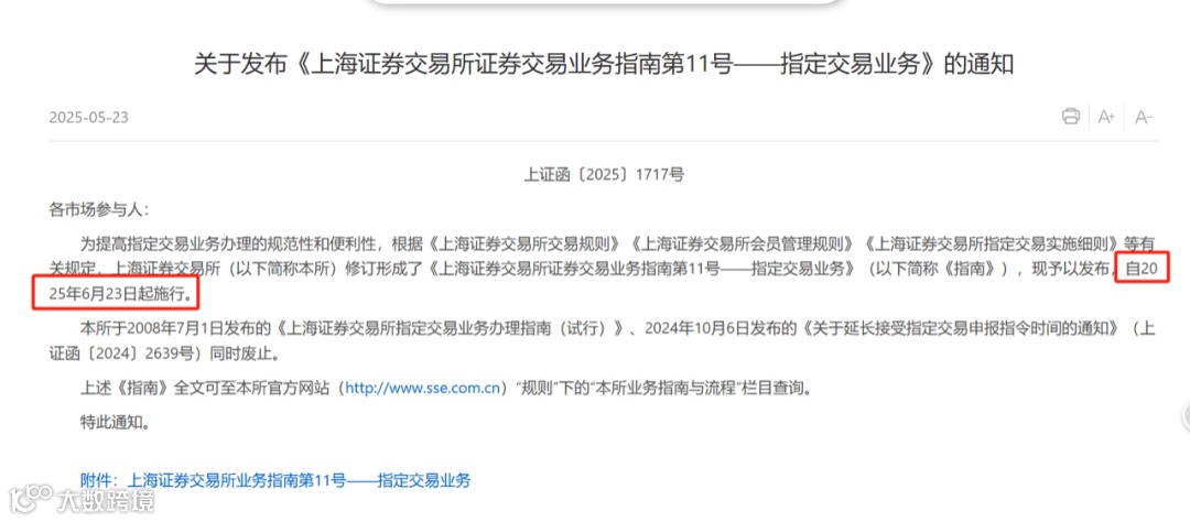今年5月23日,上交所发布了《上海证券交易所证券交易业务指南第11号——指定交易业务》,自2025年6月23日起施行。据悉,此举是为提高指定交易业务办理的规范性和便利性。