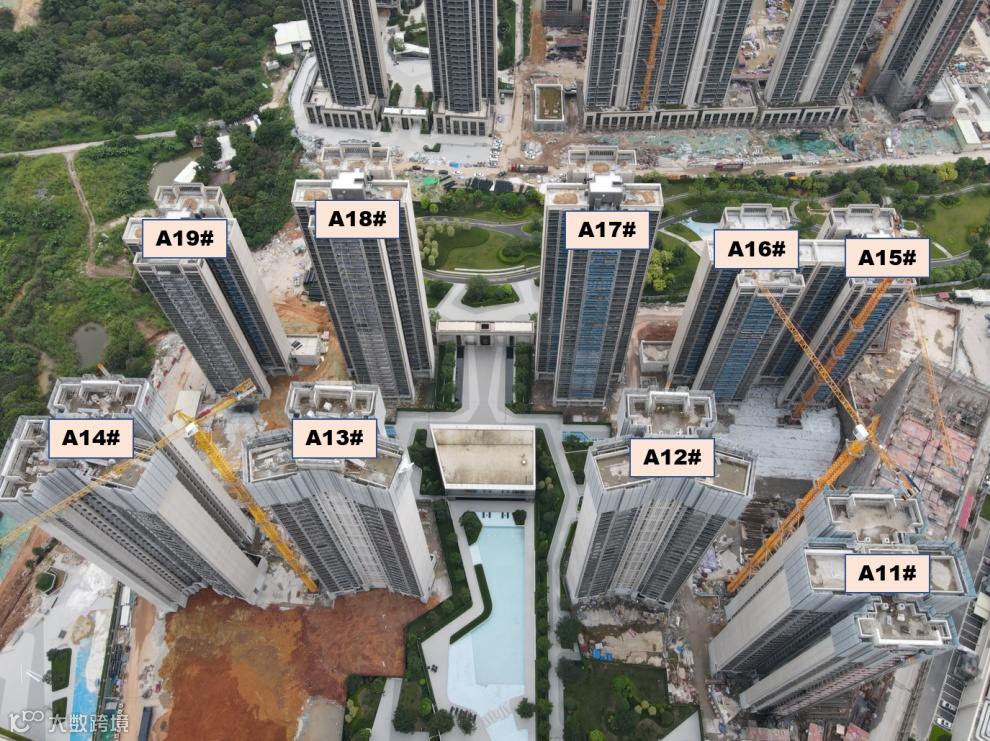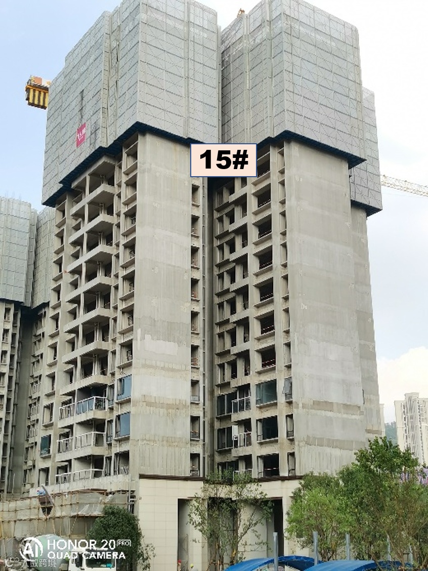 15#主体结构完成至16层;外立面幕墙完成3至5层门窗框、栏杆安装;水电预埋至17层;竖向风管完成至10层;消防立管安装至10层