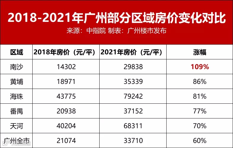 体现于楼市,发展至今的南沙吸引了越来越多人前来置业,其房价亦是水涨船高。数据显示,南沙2021年房价为29838元/平,对比2018年涨幅达109%,远高于全市平均水平。