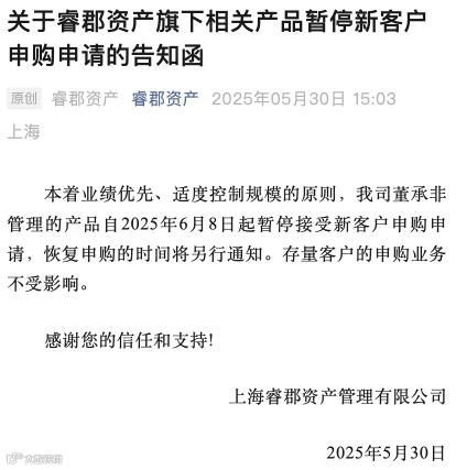 知名私募睿郡资产5月30日发布公告称,本着业绩优先、适度控制规模的原则,董承非管理的产品自2025年6月8日起暂停接受新客户申购申请,恢复申购的时间将另行通知。存量客户的申购业务不受影响。