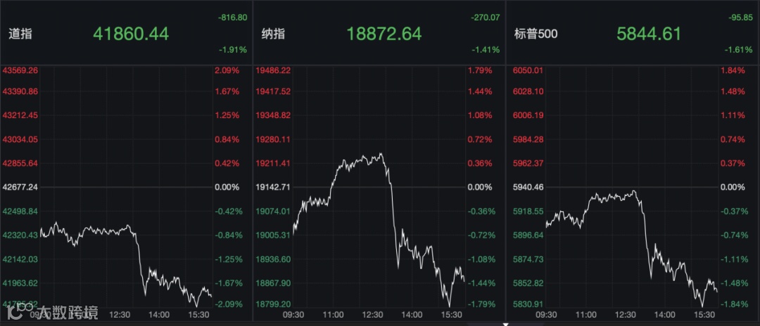 截至收盘,道指重挫超800点,大跌1.91%;标普500指数跌1.61%,纳指跌1.41%,均创一个月来的最大跌幅。