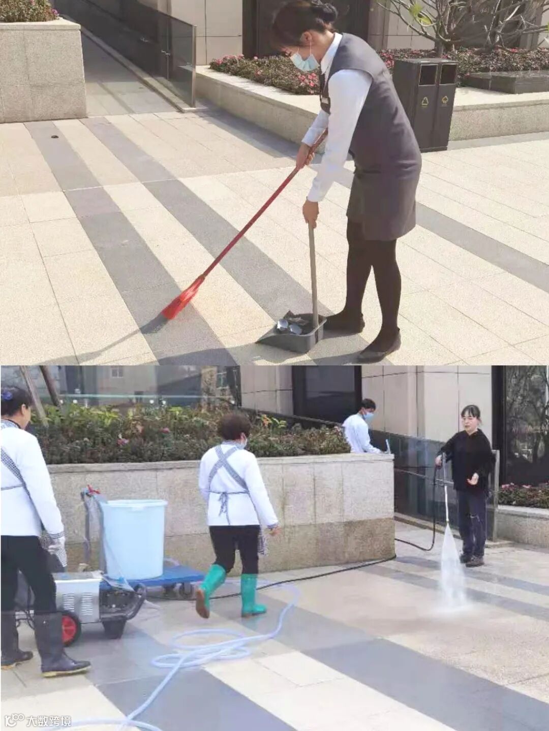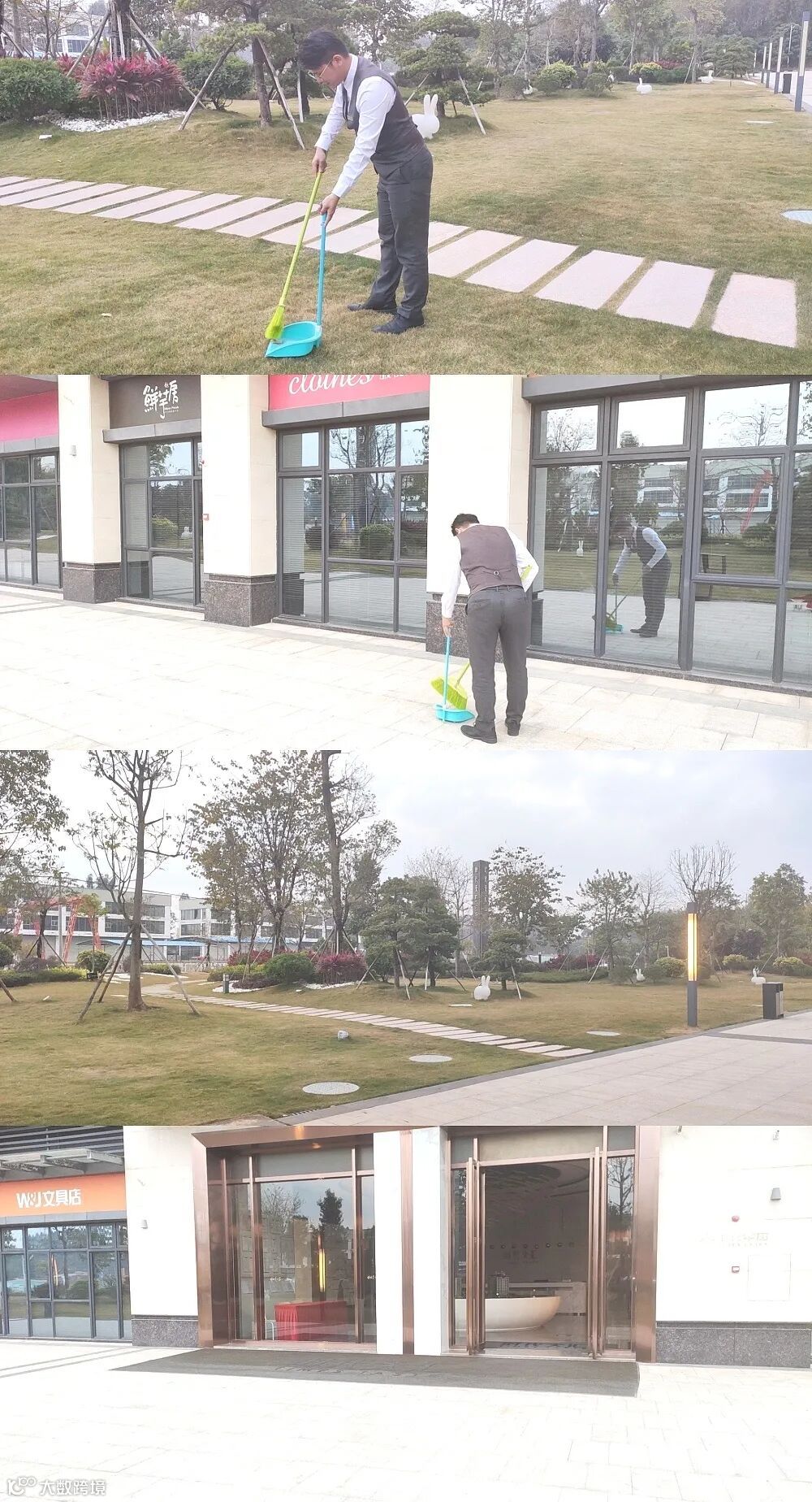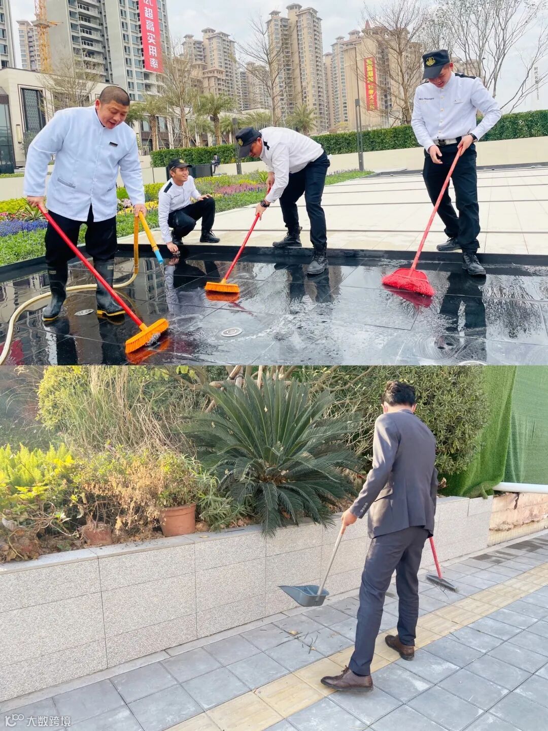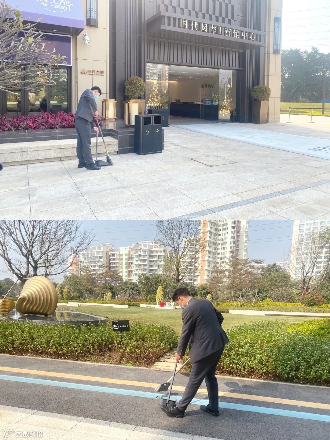 时代天汇(增城)营销部打扫了园林、走廊等多个区域,为客户与同事们提供良好的环境。时代印记(广州)营销部为保障公共区域干净整洁,预防火灾事故发生,组织销售们积极做好冬季落叶清扫工作。时代倾城(中新)营销部联合物业部门,使用高压水枪仪器冲洗公共区域,共同清理公共区域,提升环境。