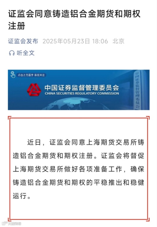 中国证监会近日同意上海期货交易所(下称上期所)铸造铝合金期货及期权注册,标志着我国期货市场首个再生金属品种即将上市。证监会要求上期所做好各项准备工作,保障铸造铝合金期货及期权平稳运行和健康发展。