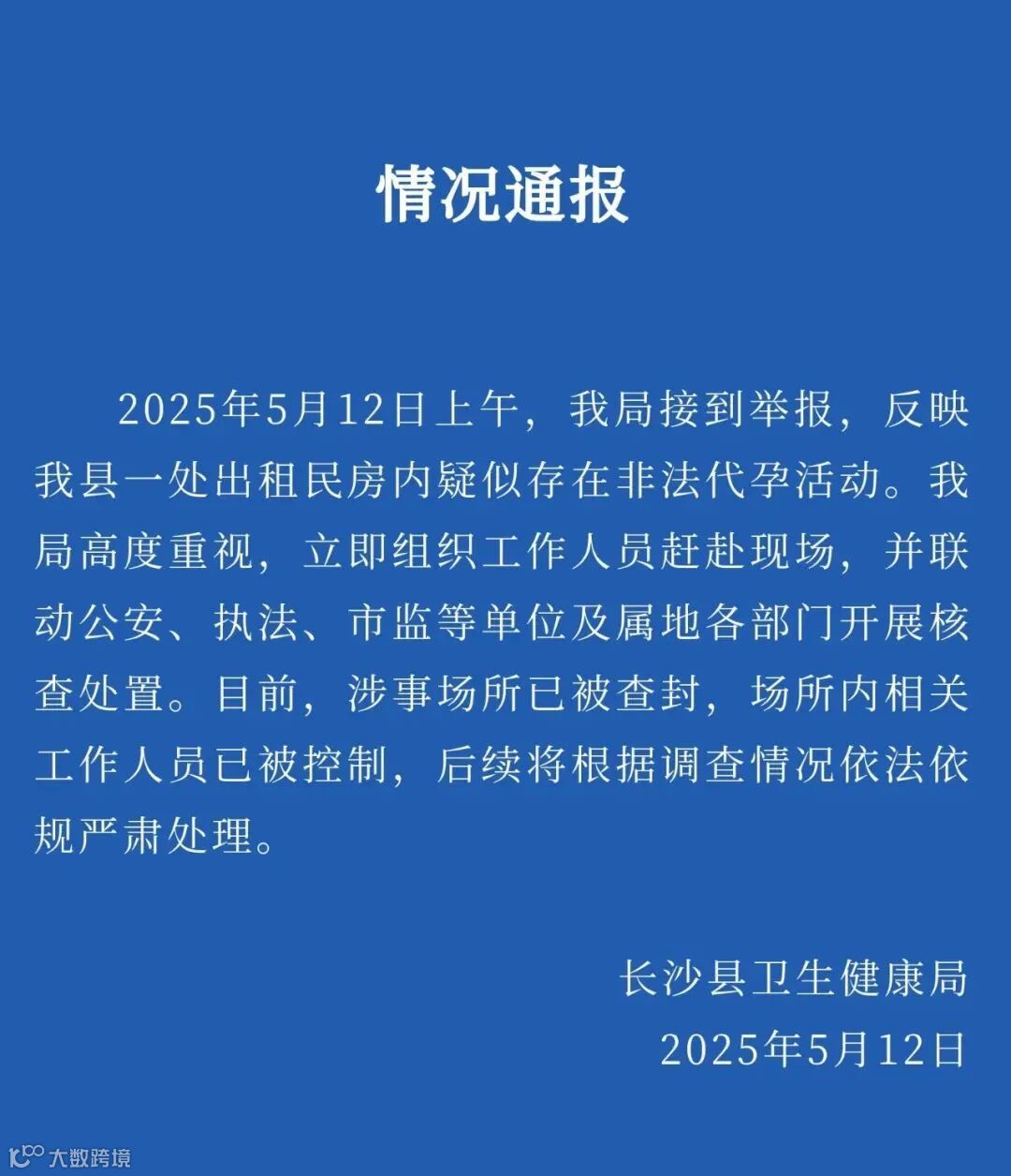 12日下午15时42分,长沙县卫生健康局发布情况通报称,2025年5月12日上午,我局接到举报,反映我县一处出租民房内疑似存在非法代孕活动。我局高度重视,立即组织工作人员赶赴现场,并联动公安、执法、市监等单位及属地各部门开展核查处置。目前,涉事场所已被查封,场所内相关工作人员已被控制,后续将根据调查情况依法依规严肃处理。