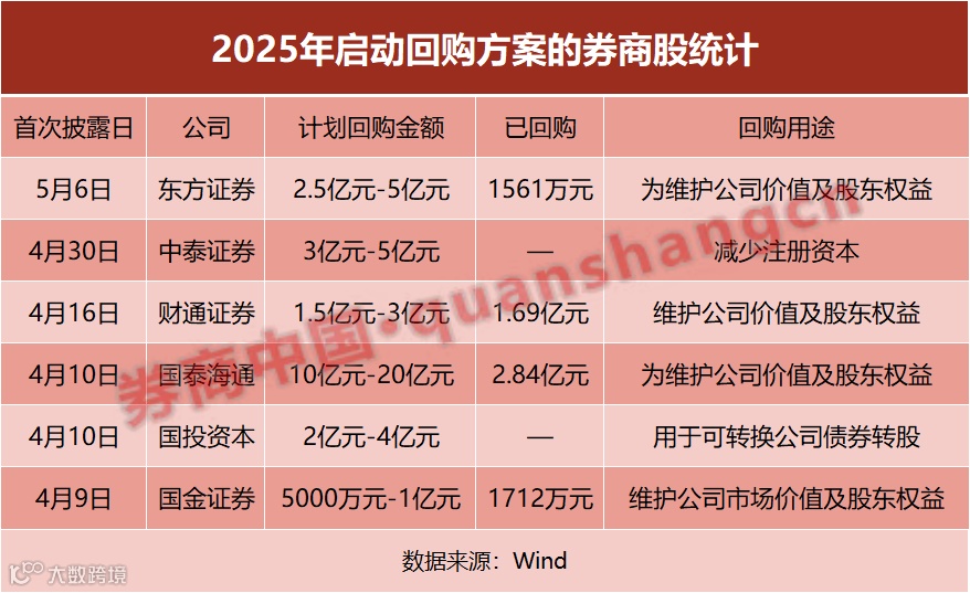 在红塔证券之前,今年已有6家券商公布了回购方案。行动最早的国金证券,其在4月8日国务院国资委发声后,第一时间公告的新一轮回购股份方案——此前在2024年,国金证券已经进行过两轮回购,分别用于股权激励和注销。