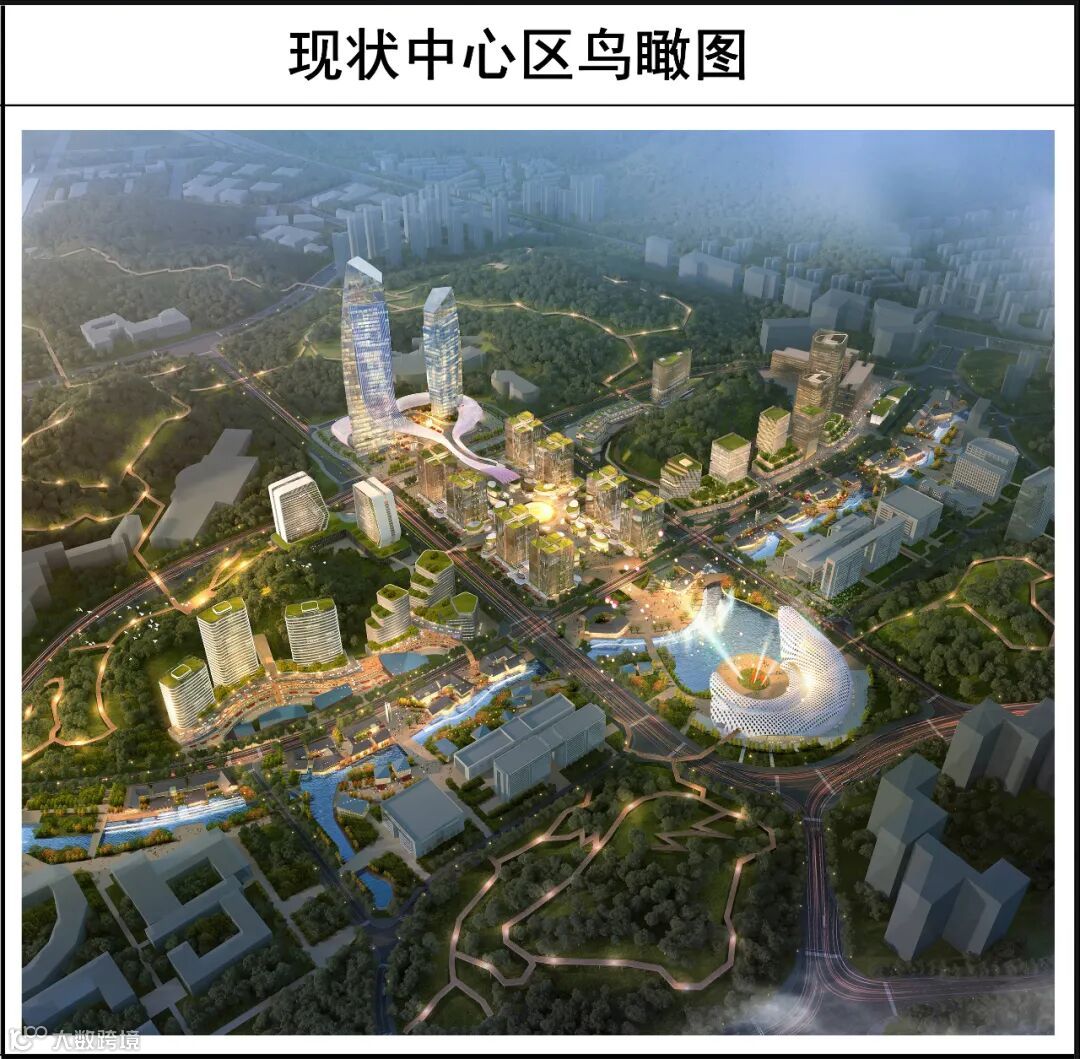 一纵:适度提高纵向绿轴广场的开发强度,增加商业、文化、人才居住等配套功能,并强化纵轴空间与周边山体、地铁站的直接联通。