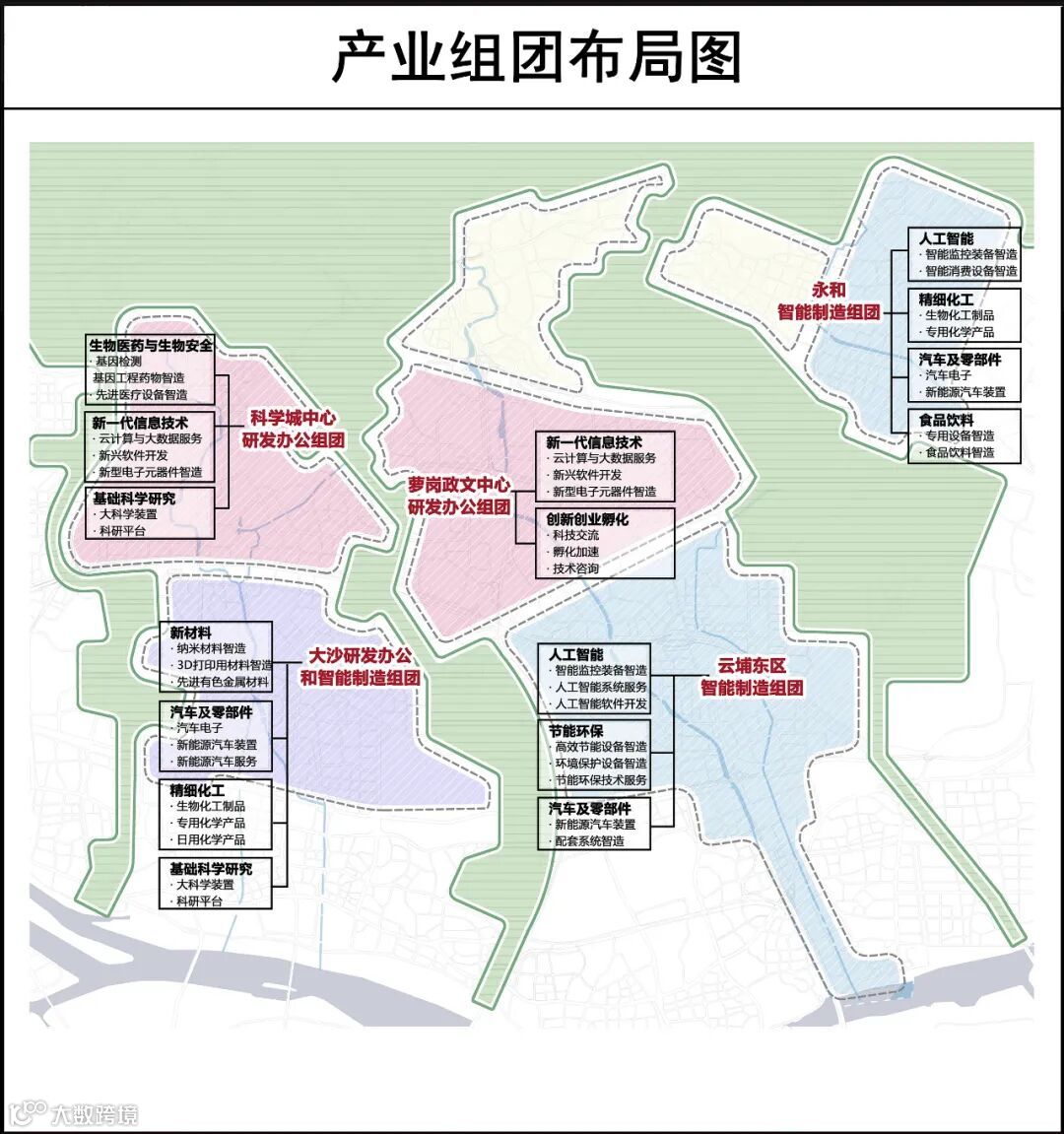 依据现状产业基础和行政边界,结合未来产业发展方向,规划为五大产业组团,包括科学城中心研发办公组团、萝岗政文中心研发办公组团、大沙研发办公和智能制造组团、永和智能制造组团以及云埔东区智能制造组团。