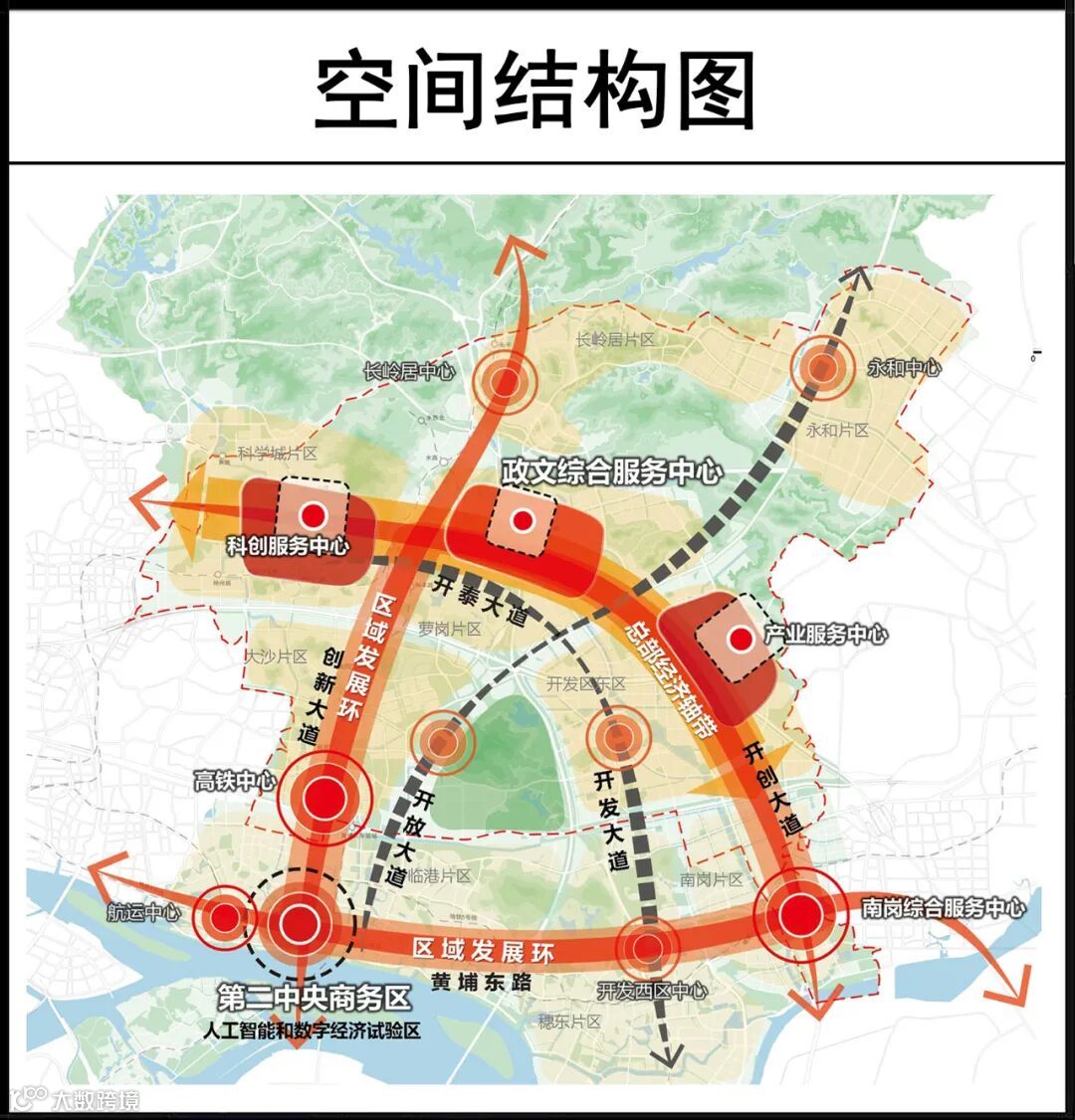 云埔中心区则将打造成服务科研、支持智造、缔造激发科技创新转化的智慧交互都市,立足生产,面向生活,构筑促进产城融合发展的多元乐活之城。其规划为“一轴一带、双心联动、多片发展”的空间结构。