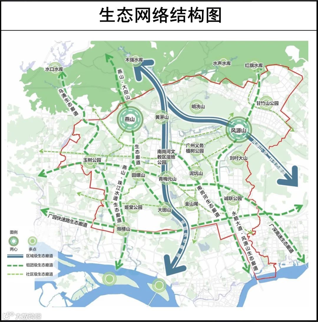 生态方面,则以构建山廊、水廊、绿廊为目标,通过联通水系构建公园体系,控制防护绿地,形成“两心、多点、链山织水”的生态网络结构。