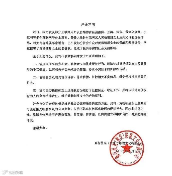 5月16日,黄杨钿甜所属公司嘉行传媒发布声明,呼吁停止造谣等侵权行为,“社会公众的合理监督是维护社会公正和法治的重要力量,我司、黄杨钿甜女士及其父母愿意接受社会公众的合理监督,但绝不姑息任何恶意造谣的侵权行为,恳请大家勿信谣、勿传谣。”