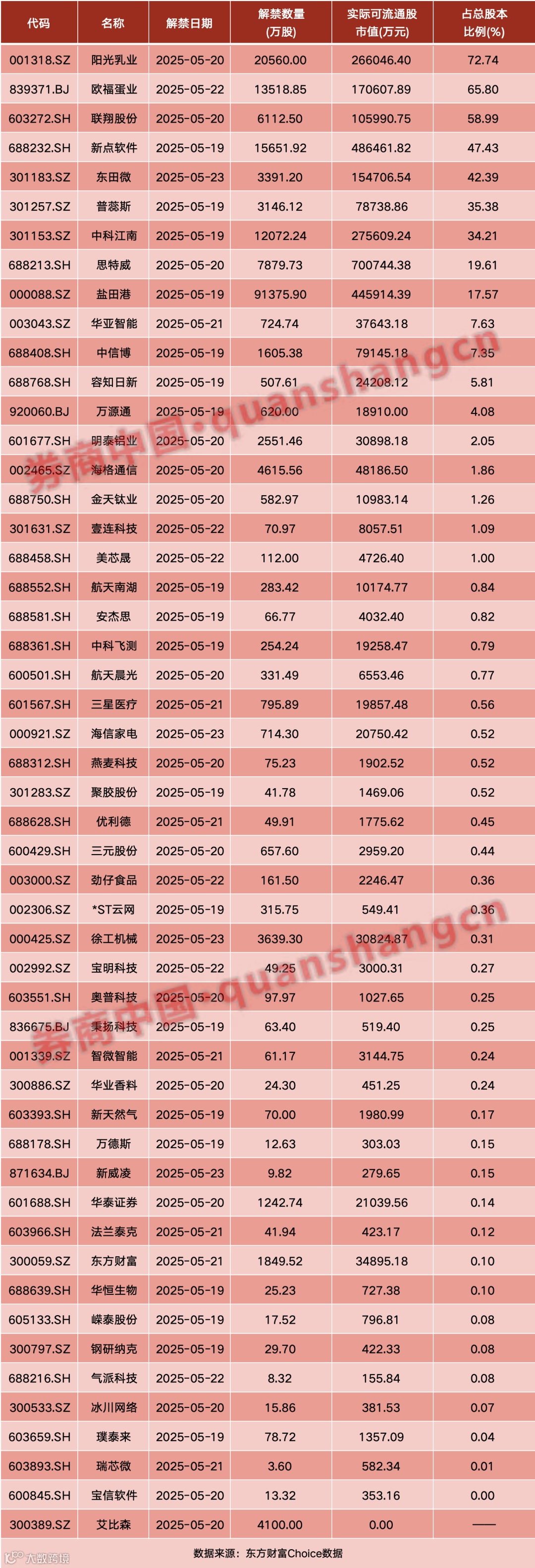 数据显示,本周(5月19日—5月23日)共有51家公司限售股陆续解禁,合计解禁量20.03亿股,按最新收盘价计算,解禁市值为314.18亿元。