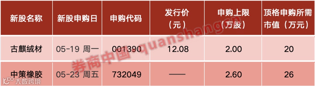 本周(5月19日—5月23日)有2只新股发行。周一:古麒绒材;周五:中策橡胶。